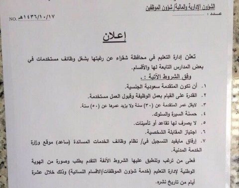 كما أعلنت إدارة التعليم عن رغبتها بشغل وظائف مستخدمات في بعض المدارس التابعة لها والأقسام وفق الشروط الأتية :