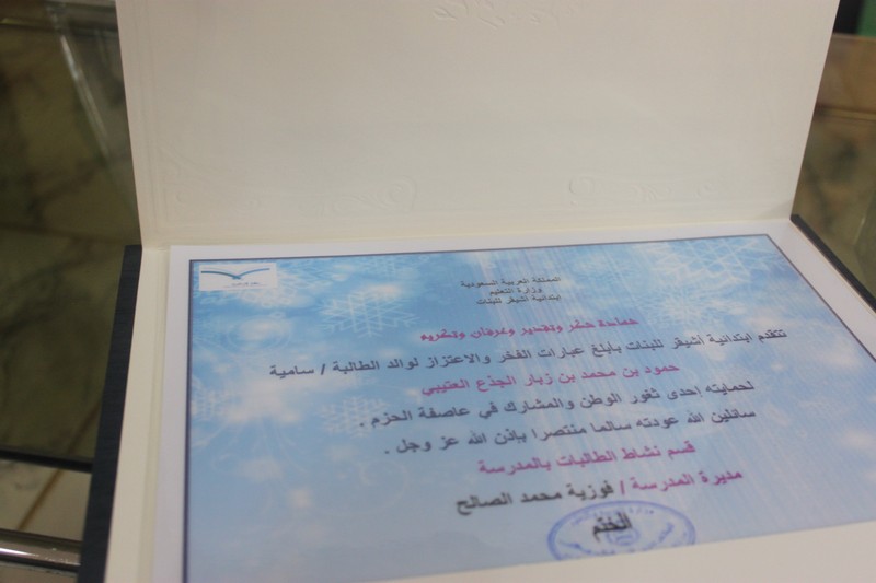تم بحمد الله وتوفيقه يوم الخميس الموافق 25 / 12 / 1436 هـ في ابتدائية أشيقر للبنات الاحتفاء باليوم الوطني الذكرى 85 لتوحيد البلاد بحضور مديرة المدرسة الأستاذة / فوزية محمد الصالح والمشرفة التربوية الأستاذة / باشة الغربي . تحت إشراف رائدة نشاط الطالبات بالمدرسة المعلمة / صفية المنيف وبمشاركة جميع منسوبات المدرسة واحتوى الحفل على العديد من الفقرات المنوعة ( قرآن كريم , النشيد الوطني للبلاد , عروض منوعة , أناشيد وقصائد , أفلام وثائقية حوارات , تكريم جنودنا البواسل) و( برنامج إذاعي متكامل عن الوطن خلال الطابور الصباحي ) .