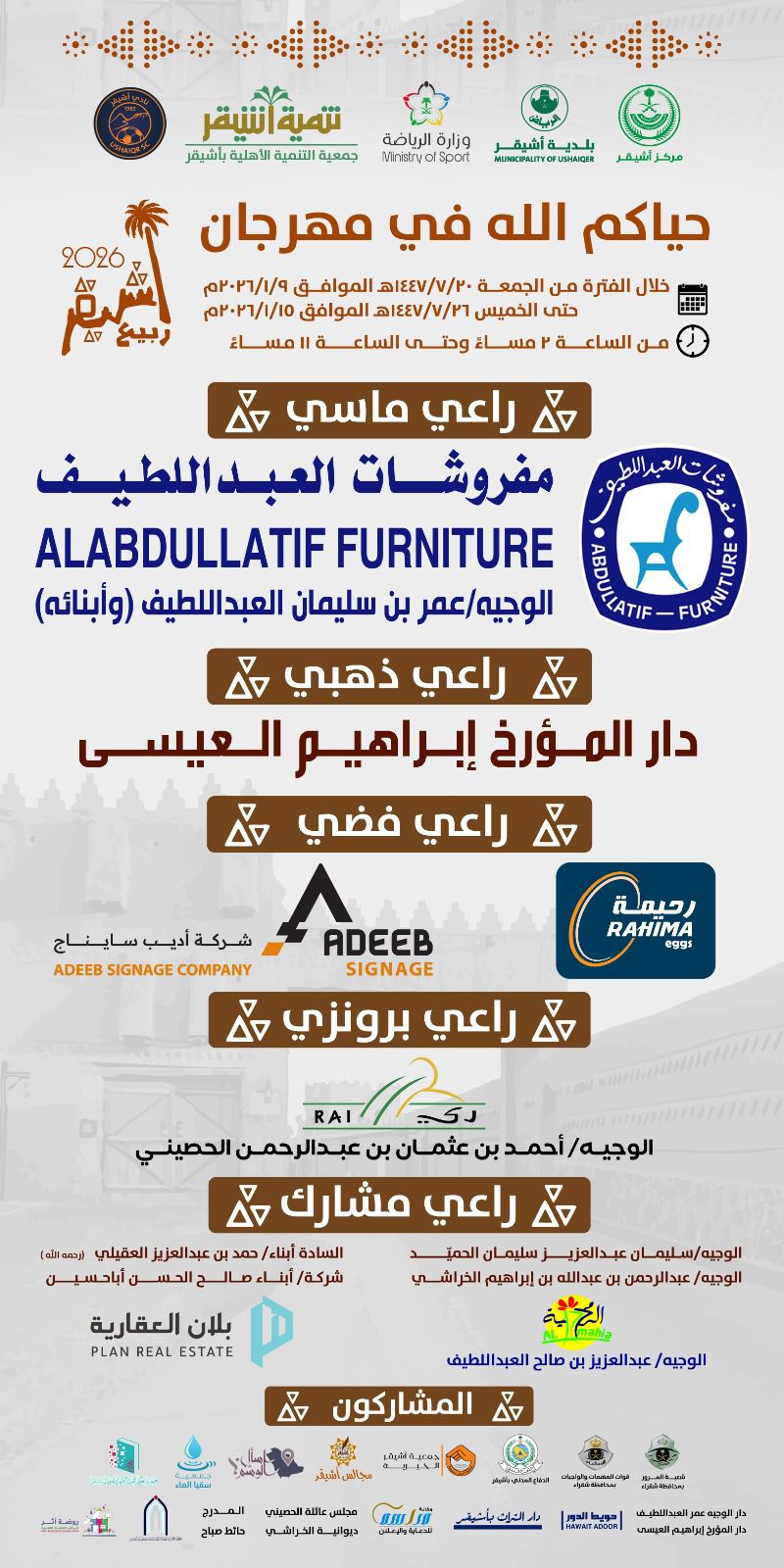 يذكر أن المهرجان والذي سينطلق في التاسع من شهر يناير لعام ٢٠٢٦م ويمتد ل ٧ أيام من الساعة ٢ ظهراً حتى ال١١ مساءً يحتوي على العديد من الفعاليات والأنشطة المختلفة حيث تتنوع الأركان هذا العام بين ركن خلاص أشيقر وركن المطاعم وركن القهوة وركن الأسر المنتجه وركن الالعاب والمسار التاريخي ( رحم نجد ) وركن الطفل بالاضافة للساحة الخارجية وخيمة الفعاليات التي تشهد فعاليات فن السامري والمزاد التراثي وأمسية شعرية واللقاءات والندوات المميزة .