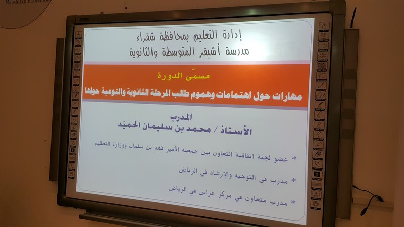 أقام الإرشاد الطلابي بمدرسة أشيقر المتوسطة والثانوية للبنين بالتعاون مع مركز مصادر التعلم بالمدرسة دورة مهارات حول اهتمامات وهموم طالب المرحلة الثانوية والتوعية حولها حيث ألقى الدورة الأستاذ/محمد بن سليمان الحميّد عضو لجنة اتفاقية التعاون بين جمعية الأمير فهد بن سلمان ووزارة التعليم ومدرب في التوجيه والإرشاد بالرياض ومدرب متعاون في مركز غراس بالرياض . وقد عادت هذه الدورة على طلاب الصفين الثاني والثالث الثانوي بفوائد كبيرة كماقدمت جائزة (آيباد) من جمعية الأمير فهد بن سلمان الخيرية لأفضل طالب يقدم فوائد من هذه الدورة . وبهذه المناسبة يسر إدارة ومنسوبي المدرسة أن يتقدموا بالشكر والتقدير والعرفان للأستاذ/محمد بن سليمان الحميد على جهوده المشكورة سائلين المولى عز وجل أن يجعل ماقدمه في ميزان حسناته إنه سميع مجيب .